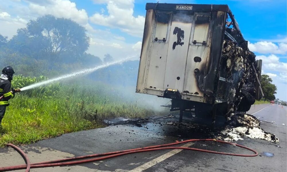 Bombeiros combatem incêndio em carreta na BR-020